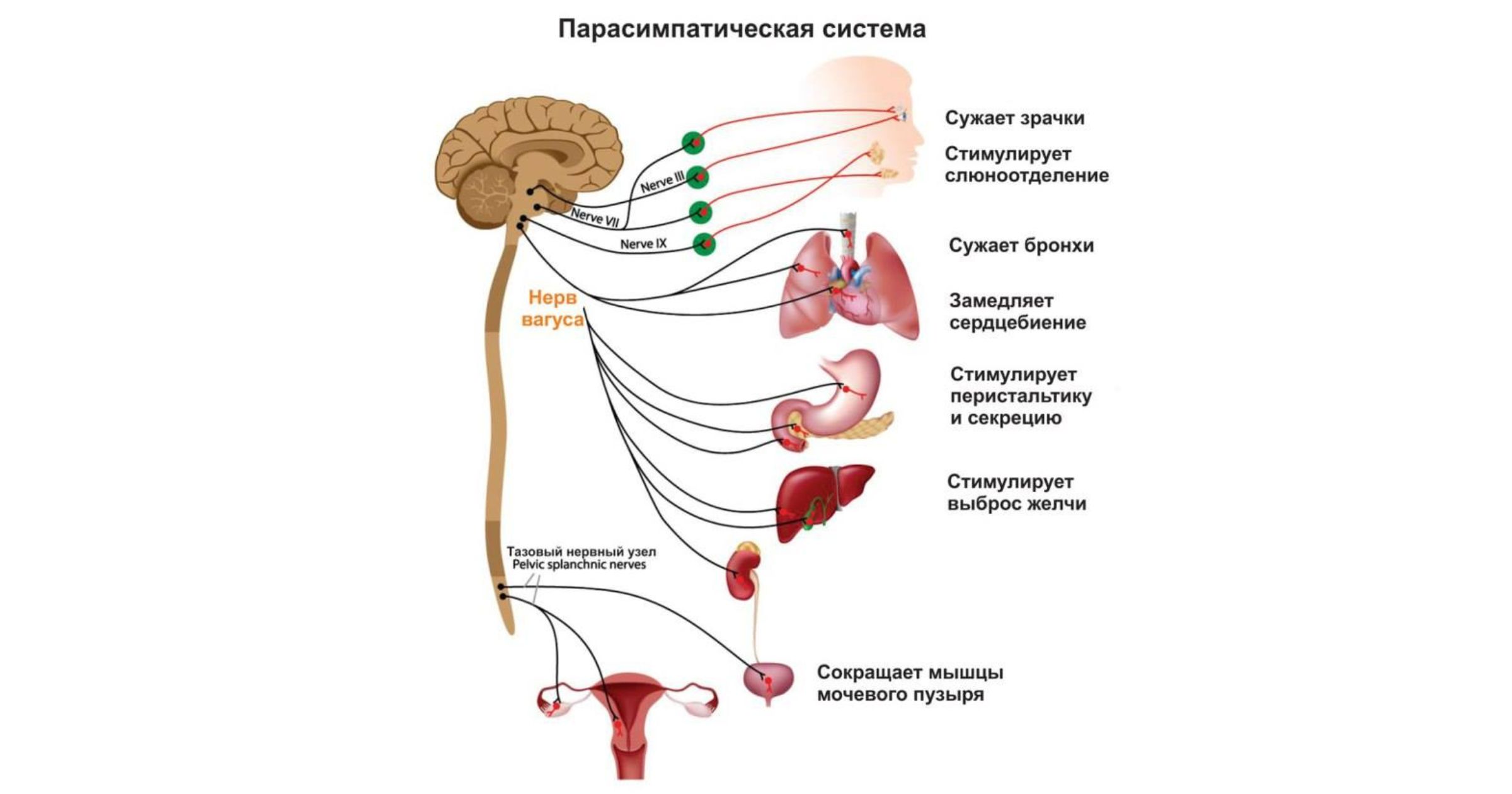 На приложенном к статье рисунке Вы можете рассмотреть, как связана парасимпатическая нервная система, в частности блуждающий нерв, с внутренними органами.